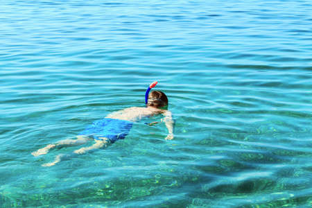 Happy kids snorkelling mask in water summer vacation, fun child snorkel outdoor sport, leisure activity for chilkdhood holiday