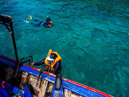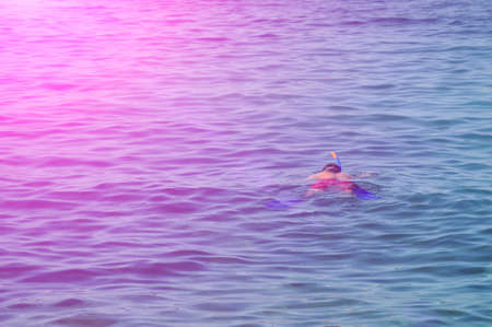 Use a floating kit to float on the sea front,beautiful ocean. Holiday, vacation, travel, diving, tourism with friends.