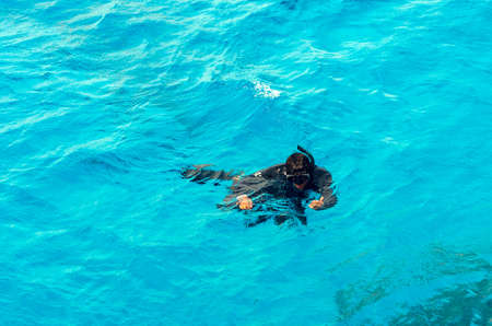 Sharm El Sheikh, Egypt, May 8, 2019: A man in diving equipment swim in the clear blue water of the sea.
