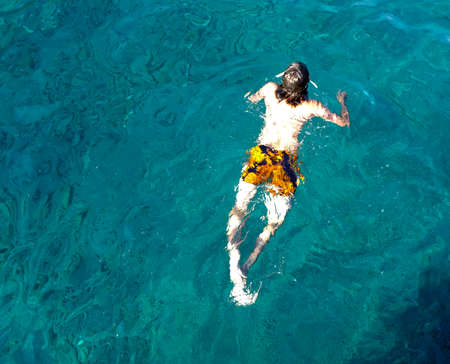 Lone adventurous youth snorkeling in remote tropical islands crystal clear waters