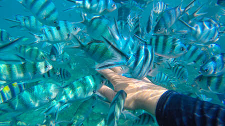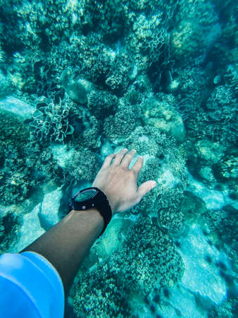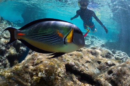 Snorkeling underwater, active travels, snorkeler watching corals and fish in the sea