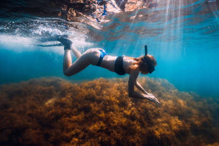 Freediving underwater in blue ocean. Sporty woman freediver swim with fins and corals.
