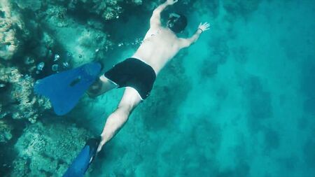 Man snorkeling underwater. Blue clear water. Copy space. Concept of travel and adventure