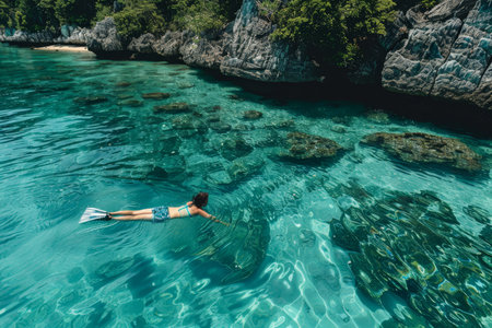 Adventurous youth enjoying snorkeling in the crystal-clear waters of a remote tropical island