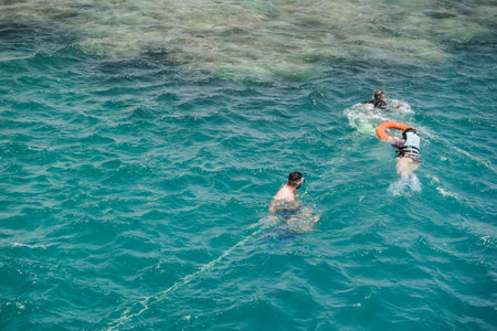 snorkeler with a lifebuoy in wonderful green sea water on a coral reef in egypt