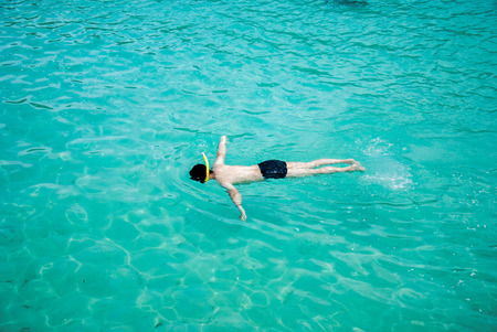 Man snorkeling in crystal clear turquoise water at tropical beach