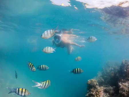 Woman snorkel swim in underwater exotic tropics paradise with school of fish and coral reef, beautiful view of tropical sea. Marsa alam, Egypt. Summer holiday vacation concept