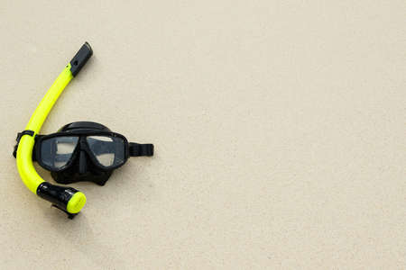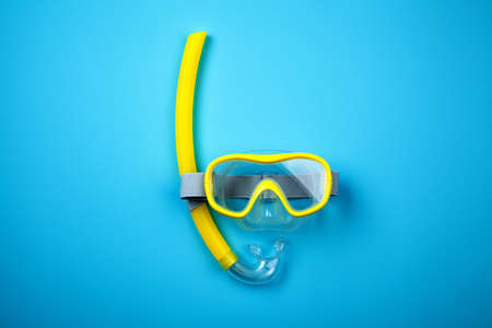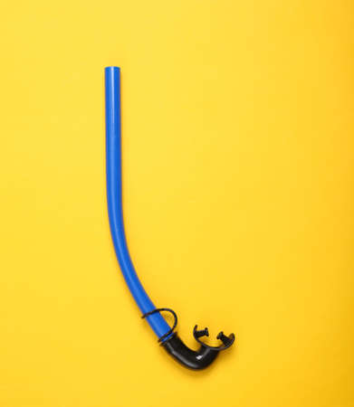 Snorkel on blue yellow background. Travel concept, vacation at sea. minimalist photo. Flat lay, top view