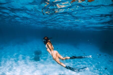 Freediver girl with fins glides over sandy bottom in transparent ocean
