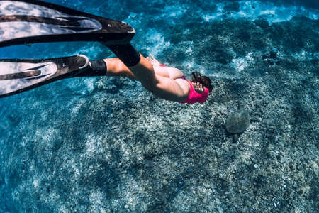 Freediver woman glides underwater with turtle in ocean. Snorkeling with green sea turtle.