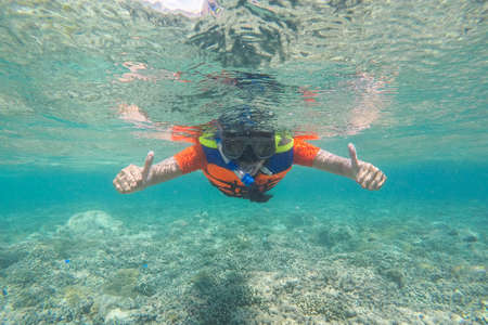 Man swimming in a mask for diving and showing a sign approx. Leisure activities at sea.
