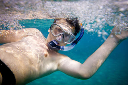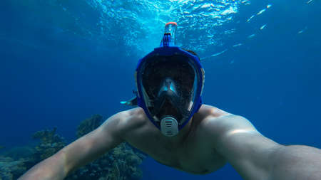 Freediver young man in mask and snorkel swimming underwater in blue sea.