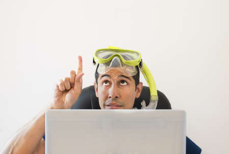 The picture of the diver is diving in the sea or ocean and wearing goggles and snorkel, the diver require skills like knowledge of the diving equipment and gear, buoyancy control and training. AIG43.