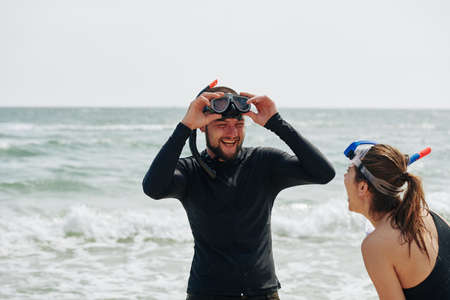 Laughing young boyfriend and girlfriend putting on mask for snorkeling in the sea