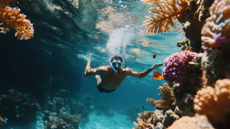 A swimmer explores vibrant coral reefs while snorkeling in clear tropical waters under sunlight