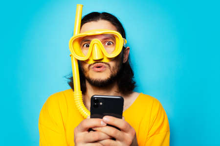Portrait of young surprised man in yellow, wearing diving mask with snorkel, using smartphone on blue background.