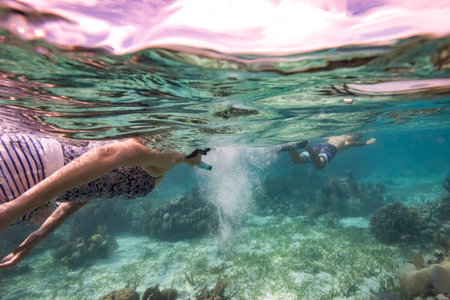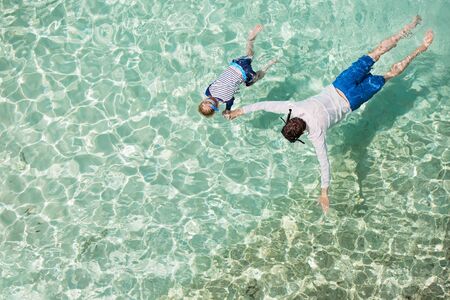 family of two, father and son, snorkeling together in beautiful turquoise lagoon at anguilla island, caribbean, family activity