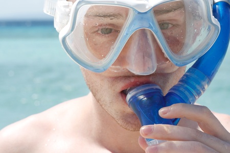 Close Up Portrait of Young Male Snorkeler with Diving Mask in Clear Blue Tropical Water