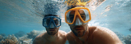 Two men snorkeling in crystal clear waters, discovering vibrant coral reefs while enjoying the stunning beauty of the underwater world and its diverse marine life