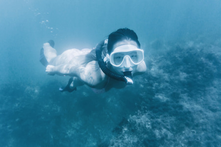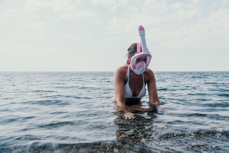 Female diver learning to dive at seashore. Woman wearing diving mask and snorkel snorkeling in sea on hot sunny day.