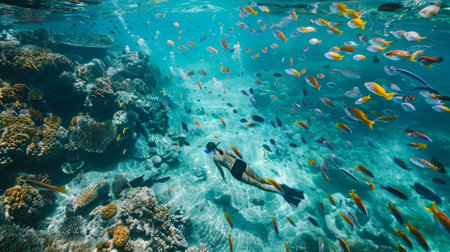 A snorkeler gracefully gliding through crystal-clear waters, surrounded by a kaleidoscope of tropical fish