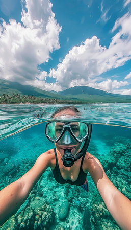 Solitary bliss woman snorkeling with mask in crystal waters of secluded tropical island