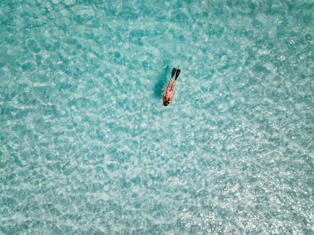 An aerial drone shot shows a person in snorkeling gear swimming in crystal-clear, turquoise ocean water. The snorkeler is floating above a vibrant coral reef, representing tropical vacation, marine life, and ocean exploration.