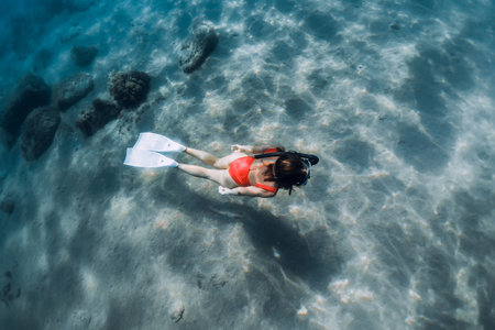 Freediver girl with fins glides over sandy bottom in transparent ocean