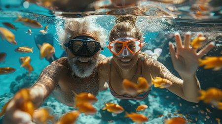Elderly couple dives into the sea. among the fish and waved at the camera.