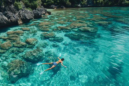 Adventurous individual snorkeling in crystal-clear waters of a secluded tropical island