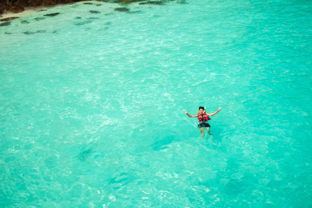 Use a floating kit to float on the sea front,beautiful ocean. Holiday, vacation, travel, diving, tourism with friends.