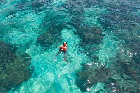 Woman is snorkeling in tropical sea for see coral reef at Gili meno. Lombok, Indonesia.