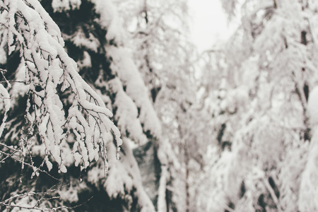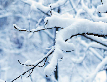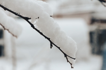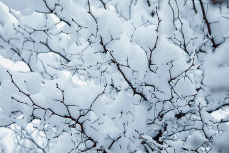 Branches under snow in hoarfrost, winter blurred natural background with bokeh, copy space