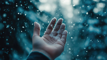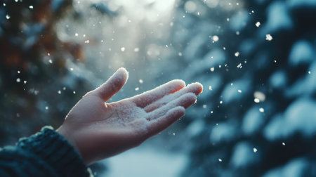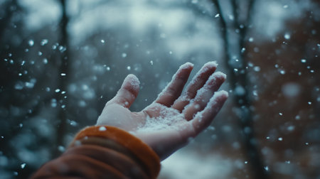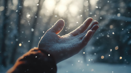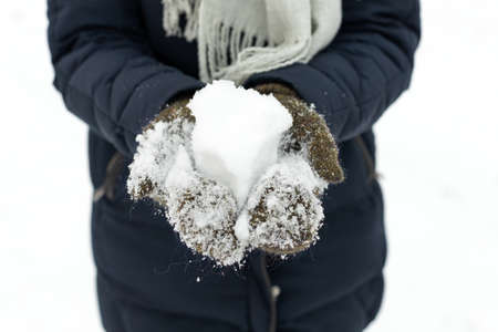 Hands hold freshly fallen snow in a winter landscape during a snowy day