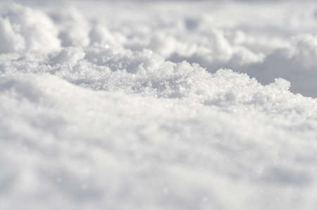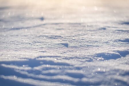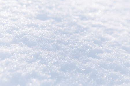 Snowy white background. The texture of the snow. Shiny snow with bokeh and blurred background close-up. White snow-covered field. Macro photo of snow.