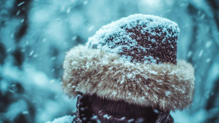 This image features a warm winter hat adorned with snow in a tranquil forest scene, capturing the essence of cozy winter days and chilly adventures.