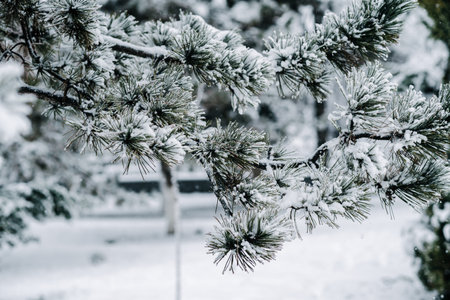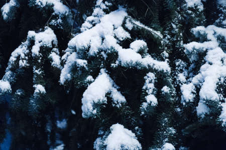 Snowfall, flying snowflakes, Branches of a Christmas tree in the city park covered with hoarfrost and snow, selective focus