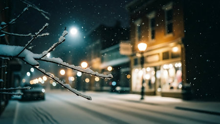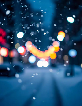 Winter brings soft snowfall to city streets, where colorful lights hang overhead, creating warm and festive atmosphere. Bokeh effect from the lights adds whimsical touch, highlighting joy of season.
