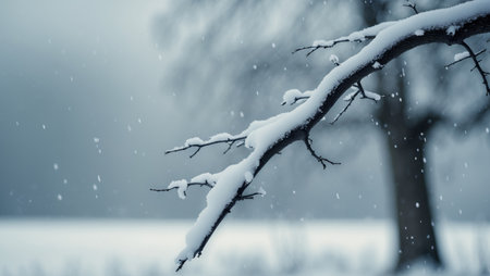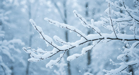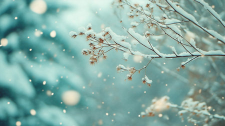Delicate branches covered in fresh snow, set against a soft blue backdrop with bokeh lights, evoke a serene winter scene. The composition is dreamy and ethereal.