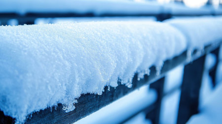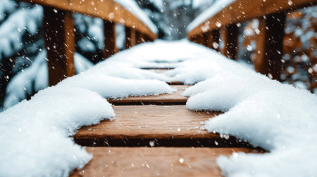 A close-up view of a wooden bridge covered in fresh snow, creating a serene winter landscape.
