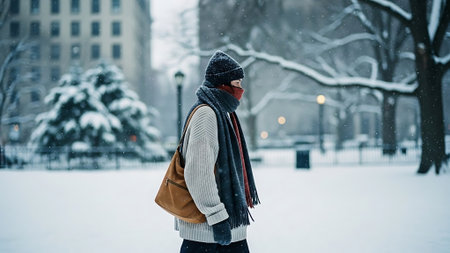 A young man in a warm hat and scarf with a backpack walks in the city on a snowy day.