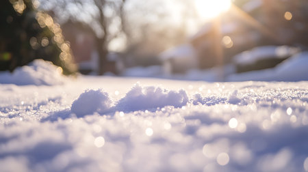 A close-up view of a snowy landscape with sunlight breaking through the clouds, casting a soft glow on the ground. The snow is pristine white and the ground is covered in a thick layer of frost.
