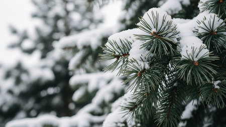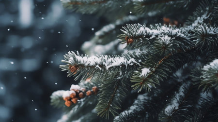 Generative AI : A blue spruce branch is covered with snow on a soft blurry background closeup macro Fluffy mild snow lies on a spruce branch