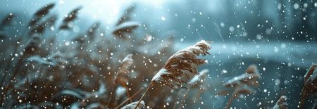 Snow falls on a field of tall grass blades. Sunlight shines through the snow.