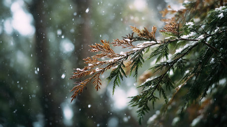 First snow falling gently on Eastern white pine, a few snowflakes drifting slowly and settling on the leaves; fresh air.