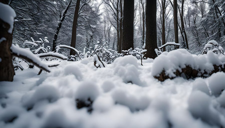 A picturesque winter scene with fresh snow covering the forest floor, sunlight shining through the trees, creating a serene and peaceful atmosphere.