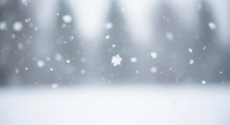 A single snowflake is in sharp focus against a blurred winter forest during a snowfall. This minimalist and serene scene captures the magic of winter Perfect for holiday cards or a peaceful background