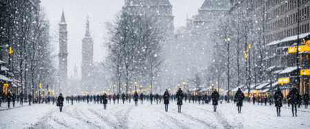 selective focus city street covered in heavy snow with people walking, city street covered in heavy snow with people walking