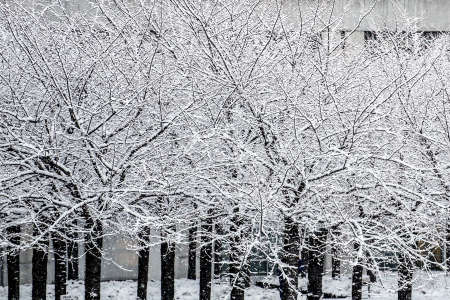 A horizontal closeup shot of a lot of bare trees covered with snow in a snowy area
