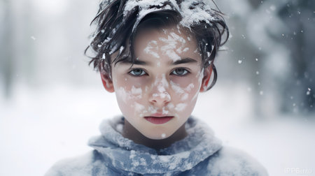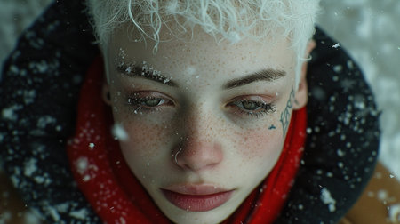 Close-up portrait of a beautiful girl with snow on her face